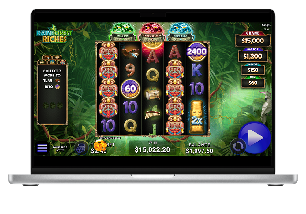 Rainforest Riches brings the excitement to new heights with Money Ball prizes, Wild Coins, and a collection of thrilling bonus features, including the Mega Pick Bonus! Pot Bonuses trigger special rounds, with the Extra Spins Feature adding bonus opportunities, and the Symbol Upgrade Feature enhancing payouts.