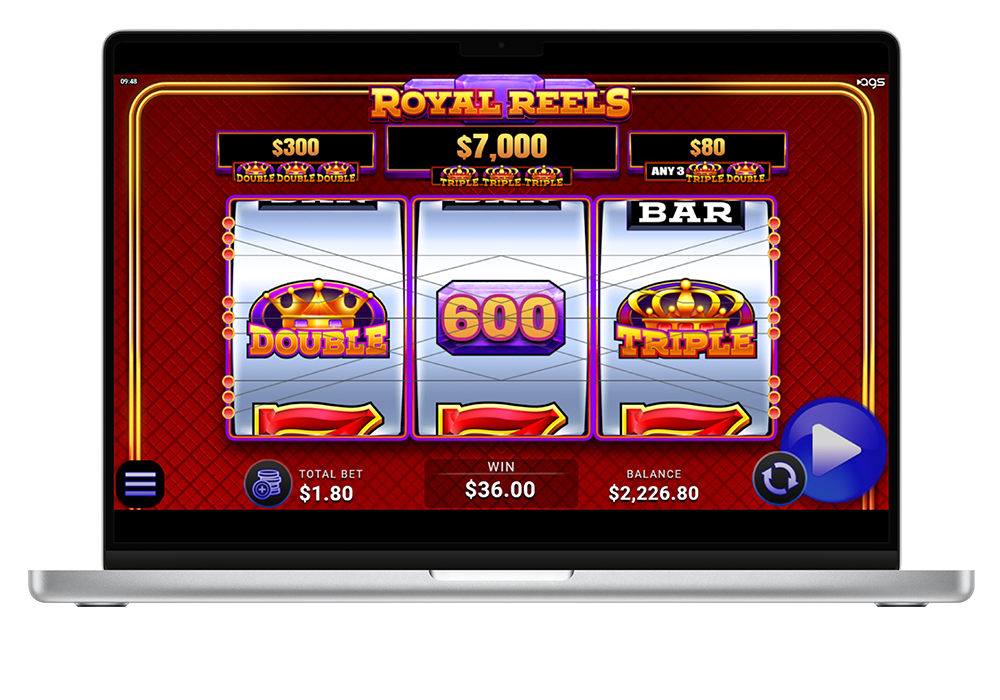 Royal Reels is a 3×3 slot game with 9 paylines, featuring classic symbols and innovative features. 2X and 3X Wild Symbols substitute for Seven and Bar symbols, with 3X symbols multiplying wins by 3x or 9x. Landing three 3X symbols awards the top jackpot, three 2X symbols trigger the second-tier jackpot, and 3 mixed Wild symbols grant the third-tier jackpot. The Cash on Reels Feature activates with 3 Cash on Reel, 3X, and 2X Wild symbols on a payline, paying the sum of the Cash on Reel values, and boosted by up to 9x with the Wild symbols.