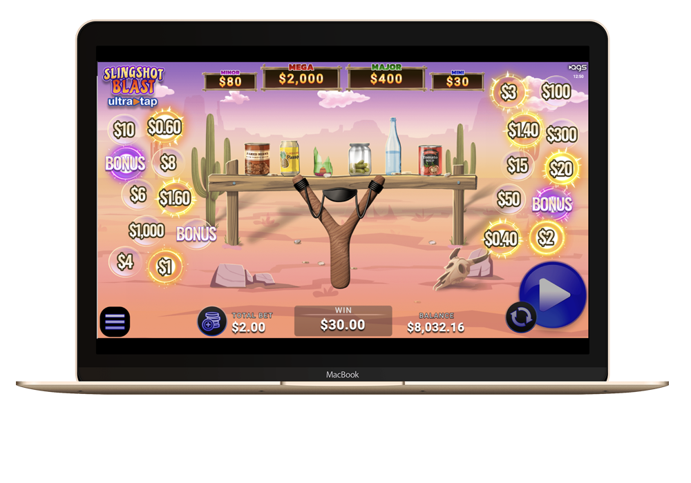 Slingshot Blast UltraTap™ is a fast-paced instant win game set in a playful desert setting with cacti and a sunset backdrop. Winning plays reveal 3 to 20 prizes on the screen, creating exciting payout opportunities. The Multiplier Feature can randomly activate, boosting wins by 2X, 3X, or 5X. The Jackpot Pick Feature adds more thrill, awarding a jackpot when three bonus prizes light up and players match three identical items in the bonus round.